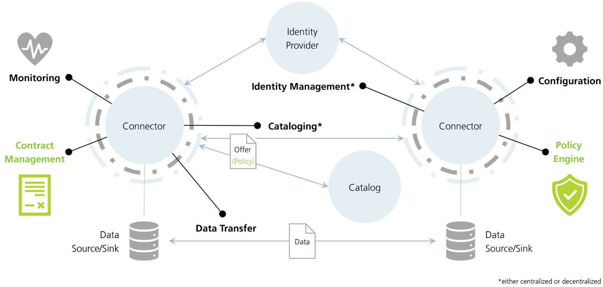 A data space is a federated, decentralized data infrastructure designed to enable cross organizational data sharing scenarios. Rather than centralizing all data, data spaces provide mechanisms such as distributed data sharing and metadata sharing to facilitate secure and trustworthy data exchange. They guarantee data sovereignty by ensuring that the data provider maintains control over who can access the shared data and under what condition. Reference architectures such as the International Data Spaces Association (IDSA) model define layers and components of a data space: the system layer includes data space connectors, a metadata broker, clearing house, app store, vocabulary hub and identity provider. Connectors provide access to data and verify participant identities, the clearing house logs transactions and events.