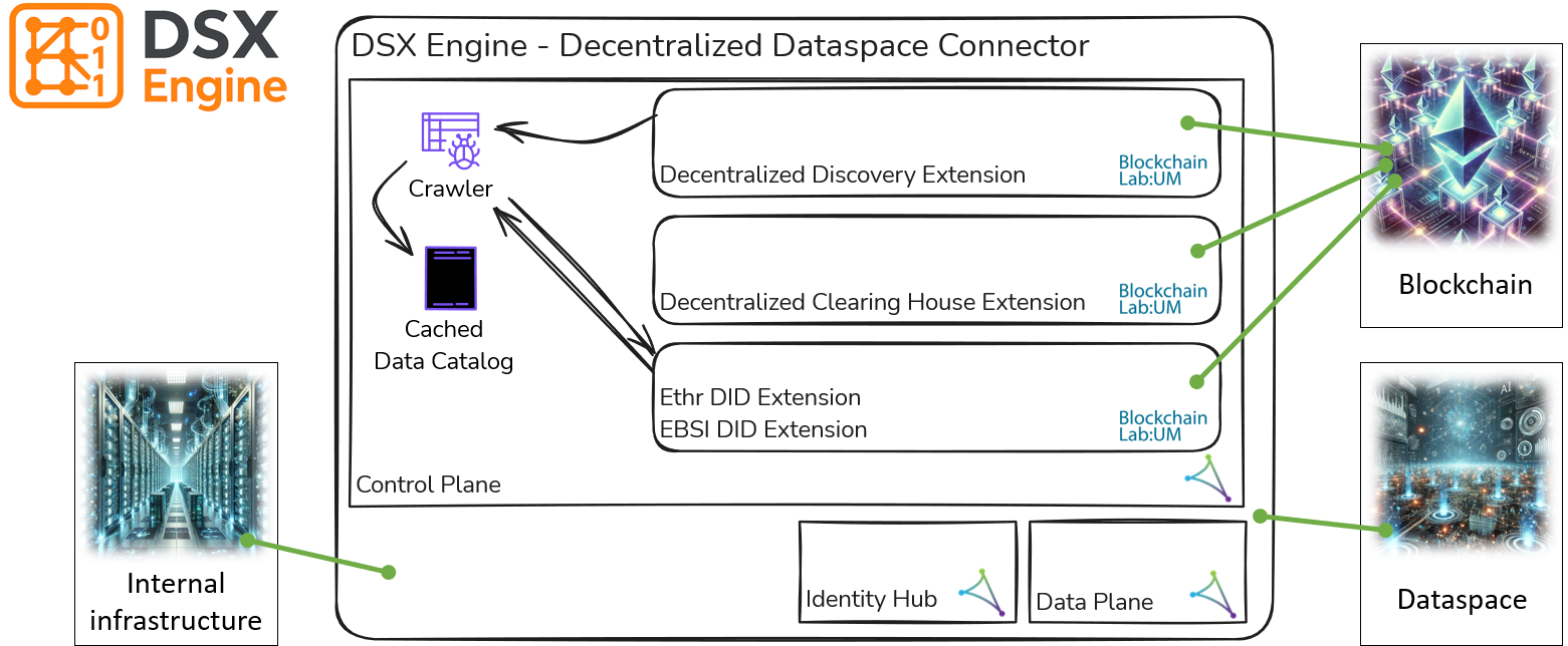 The DSX Engine extends the standard EDC framework to provide a decentralized dataspace. It introduces a decentralized participant discovery extension that connects each connector to a blockchain smart contract, allowing connectors to register and deregister themselves and maintain an up to date list of participants. When a connector starts, it calls smart contract functions to register itself; when shutting down, it deregisters. Extensions then listen to blockchain events to update the participant list, and crawlers automatically dispatch to discover catalogs from other participants. DSXE also integrates decentralized identity mechanisms by adding support for Ethereum (did:ethr) and European Blockchain Services Infrastructure (did:ebsi) decentralized identifiers, which are resolved through blockchain based registries. This allows participants to manage their own identities without relying on a central identity provider. Another extension implements a decentralized clearing house, storing logs of asset creation, contract negotiations and catalog lookups on a blockchain, ensuring tamper proof audit trails. DSX retains all core EDC functionalities: control plane, data plane, identity hub and federated catalog; but enhance them with blockchain based discovery and auditing. Contract negotiations remain a core feature: participants initiate negotiations by sending a contract request through the management API, referencing the asset and its policies. Once both connectors agree, the contract state becomes “Finalized,” and data transfer proceeds through the provider’s data plane, either via a push to the consumer’s endpoint or a pull by the consumer. The DSXE also support monetization models through support for x402 protocol, where payments are automatically executed with ERC-20 based tokens.